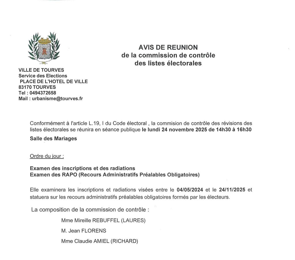 La commission de contrôle des révisions des listes électorales se réunira en séance publique le Lundi 24 novembre de 14h30 à 16h30, salle des mariages.