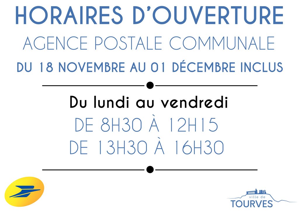 Durant la période du 18 Novembre au 01 Décembre inclus, les horaires de l'Agence Postale Communale sont modifiés.