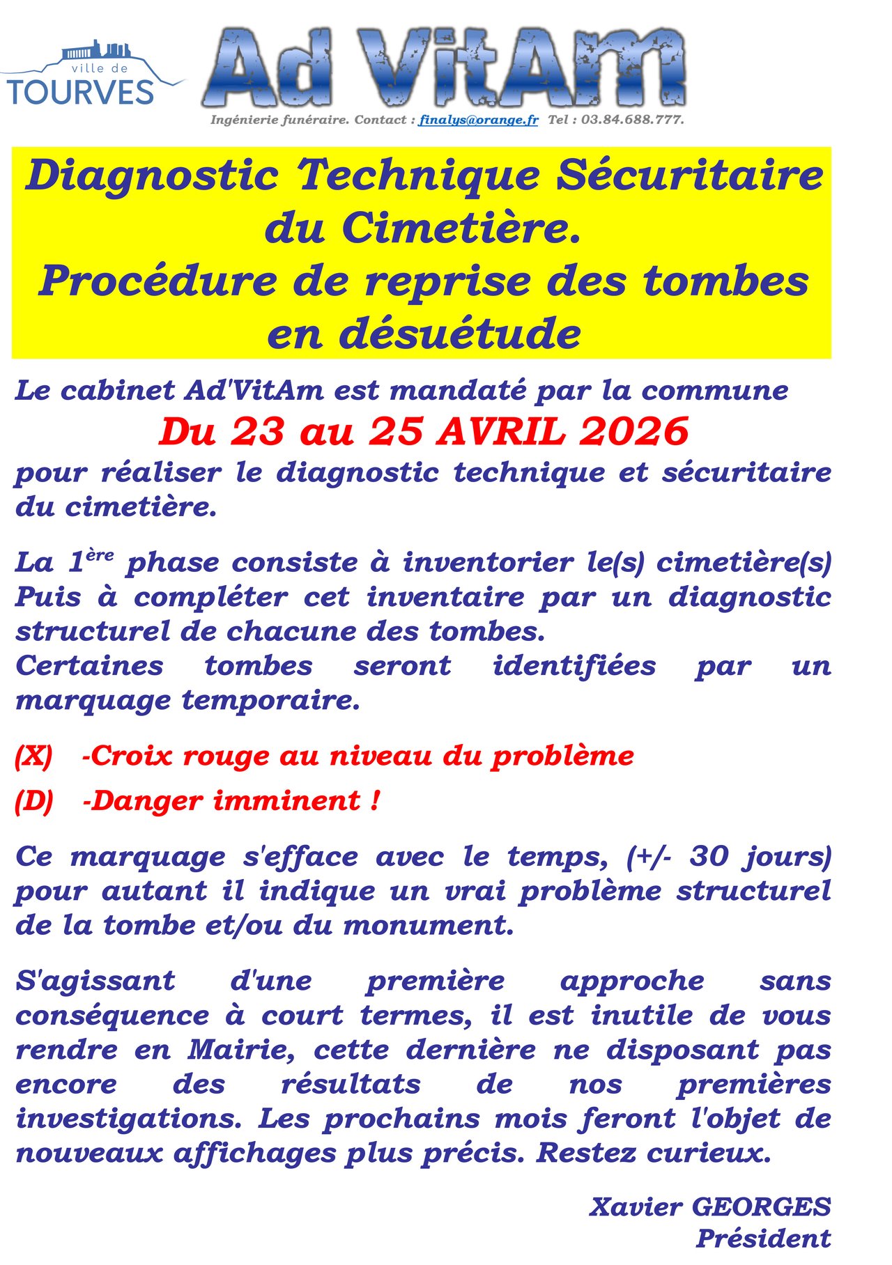Nous vous informons que la société Ad'VitAm a été mandatée par la commune pour réaliser le diagnostic technique et sécuritaire du cimetière durant la période suivante :