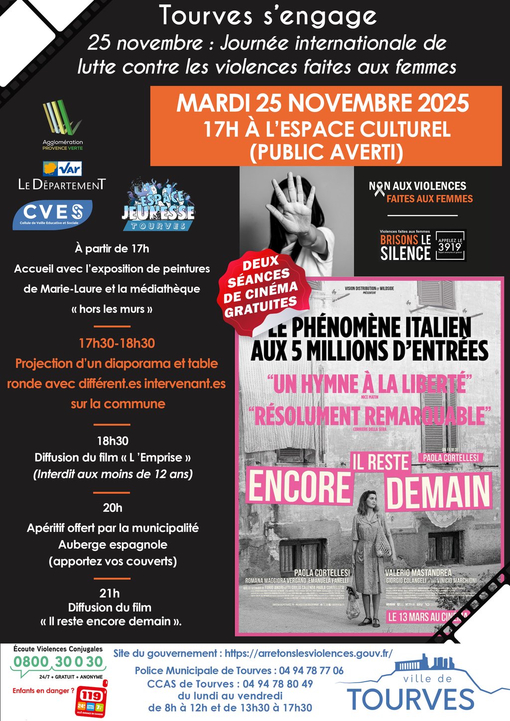 Tourves S'engage dans La Lutte Contre Les Violences 📅 Mardi 25 Novembre Séances De Cinéma📍Espace 🎟️Table Ronde, Auberge Espagnole - Public Averti