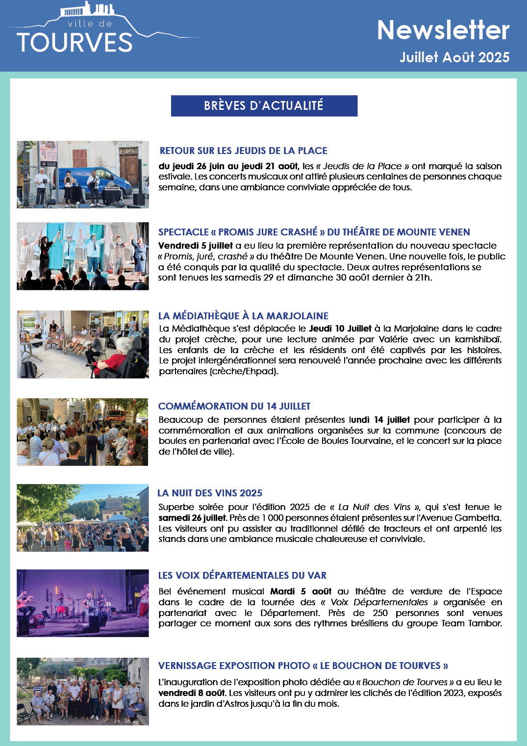 Pour recevoir chaque mois toute l'actualité Tourvaine (évènements, loisirs, culture, travaux, projet, vie municipale..) il suffit de vous inscrire en envoyant votre adresse email à communication@tourves.fr